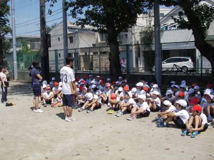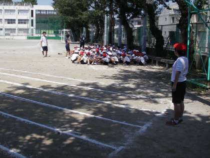 10月1日(土)は運動会です。そこで2年生以上は用賀中学校の校庭をお借りして50m走、100m走の記録をはかっています。昨日は2年生、3年生、6年生が記録をとりました。今日、8日は4年生と5年生が100m走の記録をとりました。用賀中学校の校庭は広く、校庭に斜めにラインを引くと100mが直線ではかれます。とても便利です。
