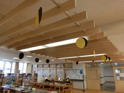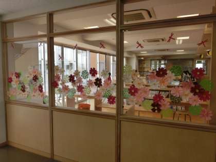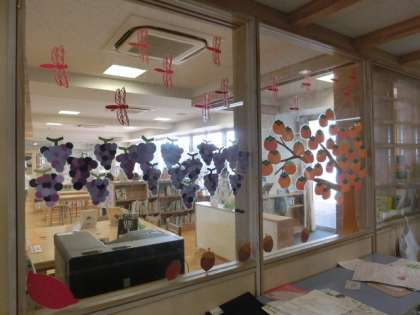 図書室を司書の先生が「秋」のイメージに装飾してくれました。秋のようすが伝わってくる植物や果物などの装飾があり、図書室に来るだけでも楽しい気持ちになります。