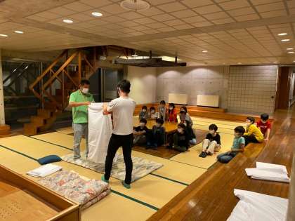 生活係に、シーツの敷き方、明日の片付け方の講習をしています。