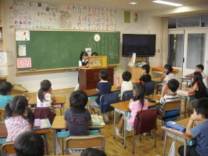 16日の国語の時間に、中学生が「かさじぞう」の紙芝居を読み聞かせしました。それを聞いた1年生から「前に読んだことがあるけど、紙芝居で読んでもらって、もっと楽しいと思いました。」という感想があり、中学生がうれしそうに照れていた場面もありました。