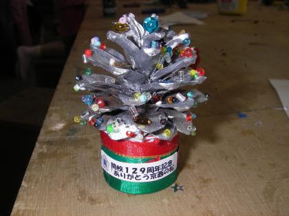 今回、このゆびとまれで作るツリーは京西の松の松ぽっくりも使われています。来年の2月以降に今の松は切られてしまいます。ですから、記念の意味を込めて使うことにしました。作ったツリーの台には「開校129周年記念 ありがとう京西の松」のシールが貼られています。
