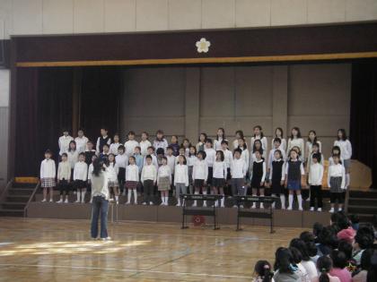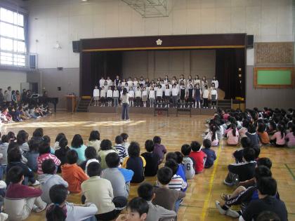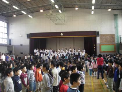 3曲目は、全校全員合唱です。「大きな古時計」です。体育館に子どもたちの歌声が響き渡ります。