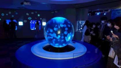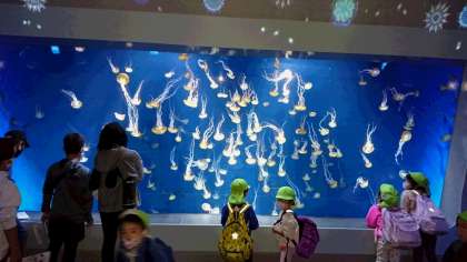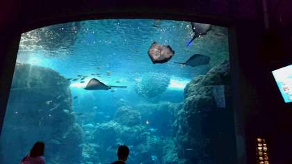 江ノ島水族館で観賞中です。大水槽を泳ぎ回る魚の大群やゆったり漂うクラゲなど、見ごたえ満点です!