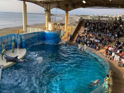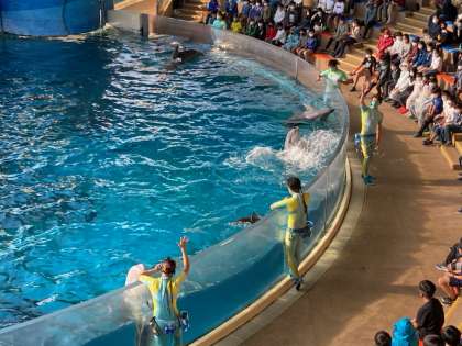 新江ノ島水族館で最後のイルカショーが始まりました。家から持ってきた合羽を着ている最前列の子もいます。
