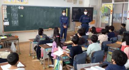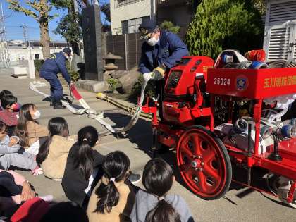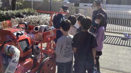 社会「火事から地域の安全を守る」の学習では、消防署見学に続き、消防団の方が学校に来ていただき、お話を聞きました。下半式ポンプ車や防火服の見学、消防団の仕事の内容などたくさんのお話をいただきました。子どもたちにとって、地域の方々が協力して、地域の安全を守っていることを学ぶことができました。