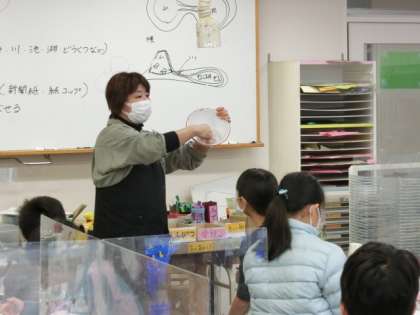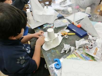 専用の段ボール紙の上に紙コップや新聞紙を置いて島に模様や起伏を作り、