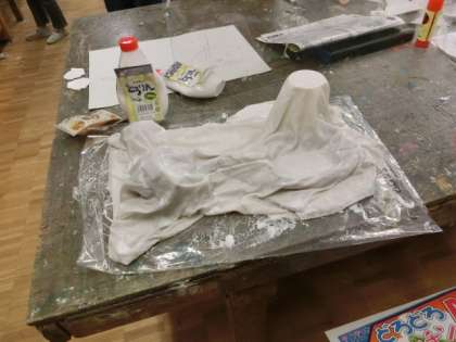 その上から特殊な液体粘土を染みこませた布を被せて、島を表現しています。