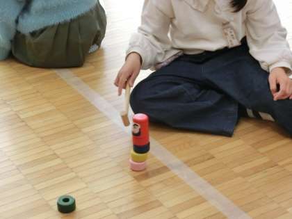 今日は、おはじき、けん玉、こま、だるま落とし、お手玉などの昔遊びを体験しました。
