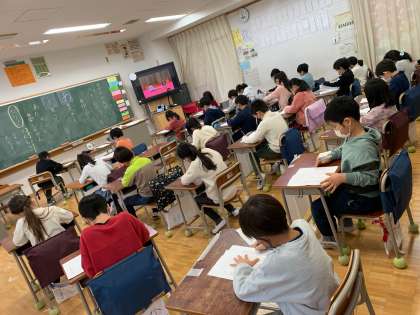 始業式にて、3学期は学習のまとめの時期であることや、前向きに努力し続けることの大切さのお話を聞いたその後に、1年生は書き初め大会を行いました。