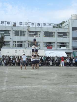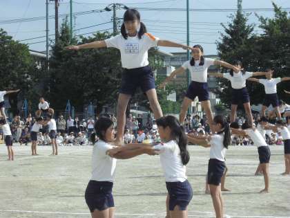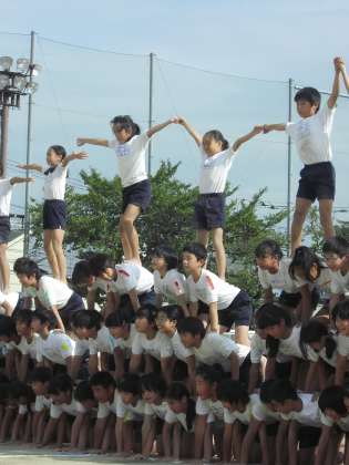 表現の最後は六年生の組体操「未来への道標」です。組体操をする六年生の姿はは下学年の憧れです。最近の子どもたちは、痛いからやりたくない、怖いからいやだ等々の理由で辛いこと、大変なことを避けようとしがちです。しかし、辛いけどそれを乗り越えやり遂げる、苦しいけど耐えて耐えて完成させる等の経験はとても大事です。組体操はその意味で価値ある取り組みです。一つ一つの技をやり遂げ、協力して辛さに負けずやり遂げ、完成させた六年生は充実感、達成感を確実にもったと思います。見ていて涙の出る演技でした。