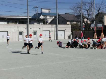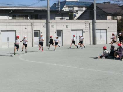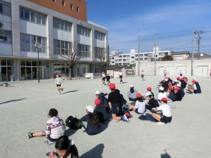 今週から持久走期間になり、校庭体育では持久走の練習が始まりました。