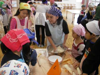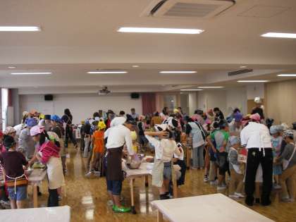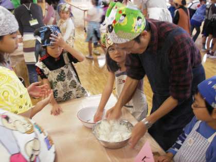 次に、練って、こねて、踏んで、延ばして、切ってというように進んでいきます。多目的室は子どもたちでいっぱいです。大人と合わせると百人は越えています。