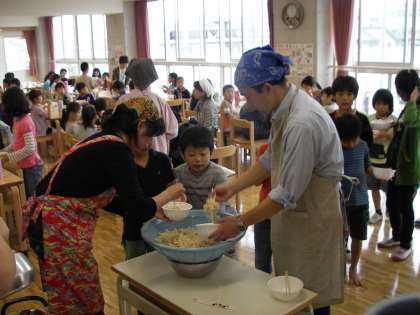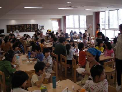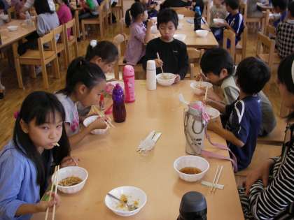 手作りうどんは見事完成です。みんなで会食です。大うどんパーティーです。太さがばらばらにところもありますが味は最高です。美味しいのです。一杯は軽く平らげ、早速2杯目3杯目とお代わりをしてい子がたくさんいます。おかわりにも長蛇の列です。自分で作ったうどんの味は格別です。