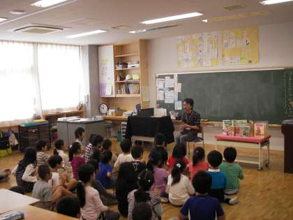 でも、私たちにも任せてください、という方がいます。図書館の方々です。2年生の3クラスに1時間ずつ読み聞かせ、お話をしてくださいました。玉川台図書館の方々は様々な本や絵を準備して京西小学校にやってきました。