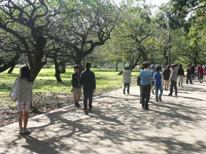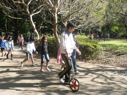 3年生は、今日の算数の授業を砧公園で行いました。1kmという長さが、一体どれくらいの長さなのかを、体験を通して学ぶ学習に取り組みました。まず、10mの長さを何歩で歩けるかを一人ひとりが試しました。その後、それをもとにして、1kmの長さを体感で測りました。スタート地点から1km進んだと思った地点で子どもたちが一人ずつ立ち止まり、その精度を競いました。ずいぶん手前で立ち止まる子、1kmを大きくオーバーしてから止まる子など様々でしたが、みんな楽しく勉強しました。