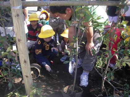 27日に新校舎落成記念植樹をしました。1年生と6年生、3年生と5年生、2年生と4年生がグループを組み「カナメモチ」という木を植えました。