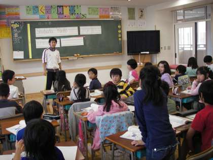 1日(火)3年生の授業風景はどんな様子なのでしょうか。1組は柴田先生です。教科は国語でした。ローマ字の学習をしています。英語とローマ字の違いは何ですか。との質問に、英語は犬をドックというますが、ローマ字は日本語をアルファベットで「いぬ」と書きます。と答えていました。