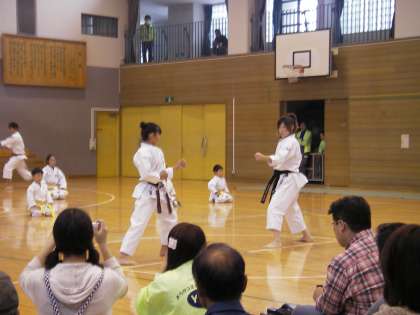 昼のイベントは体育館です。空手道クラブには京西小学校の子どもたちも参加し力強い空手の型などを見せてくれました。