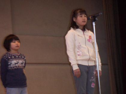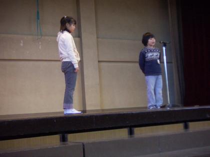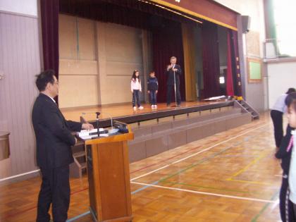 三年生の代表二人が三学期の目標を全校児童の前で話しました。