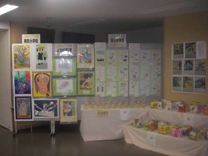 体育館入口横には、ようがの学び舎用賀小学校、用賀中学校の児童・生徒の作品が展示されています。ようがの学び舎の作品交流です。