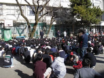 1月の避難訓練は、不審者が侵入したという設定での訓練でした。子どもたちは落ち着いて避難し、静かに集中して副校長先生の話を聞いています。