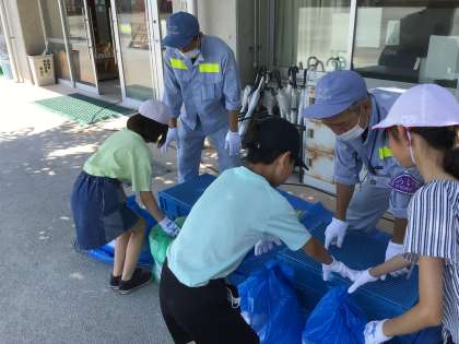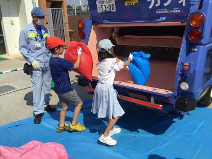 ごみ収集車「カティ」が学校に来た時には、目を輝かせながら授業に参加していました。ごみ収集車に乗り日々働く方々から、たくさんのお話をいただきました。子どもたちにとって、ごみはどのように工夫されて処理・利用されているのか、学ぶことができました。