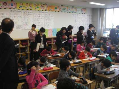 ようがの学び舎研究会では用賀小学校の先生方と一緒に勉強します。各クラスにおおくの先生方が参観しました。