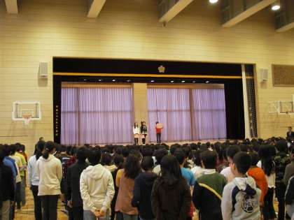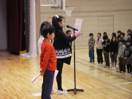 三学期は三年生のあいさつです。頑張ることを堂々と発表しています。聴いている子どもたちの姿勢も背筋がピンと伸びています。