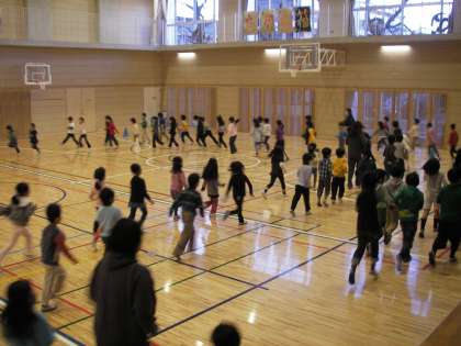 三学期最初の体育朝会は持久走です。1、2年生は体育館、3、4年生は第2校庭、5、6年生は校庭で走ります。