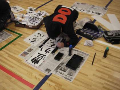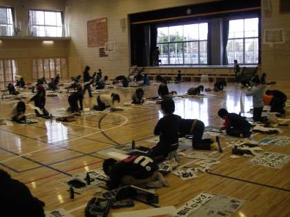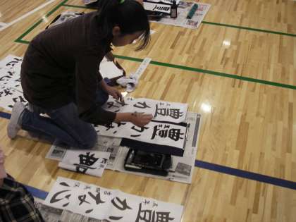 今日と明日は体育館で三年生以上が書き初めをします。今日12日の3、4時間目は5年生が書き初めに挑戦していました。「豊かな心」と書いています。