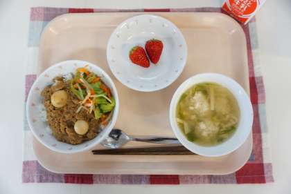 今日は6年4組が、家庭科の授業で考えた献立です!台湾料理の案が出てくるとは思わず、驚きました。『ゴンワンタン』は栄養士も初めて知る料理でした。彩りも考え、『赤が足りない!』ということでいちごを追加してくれました。