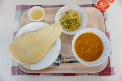 今日の給食は、珍しく『ナン』が出たため、子どもたちが大喜びな様子でした。バターチキンカレーは、バター、生クリーム、トマトをたっぷりと使って作ります。まろやかでコクのあるカレーは大人気でした。