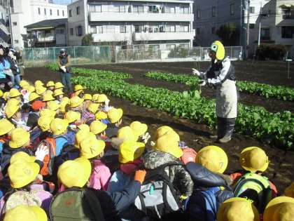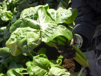 畑の方から小松菜の種類や収穫のしかたについて話を聞き、その後に収穫を始めました。はじめはうまく抜けなくて葉だけ引っ張っていましたが、根元をつかんで抜くコツをつかみ、たくさん収穫できて喜んでいました。