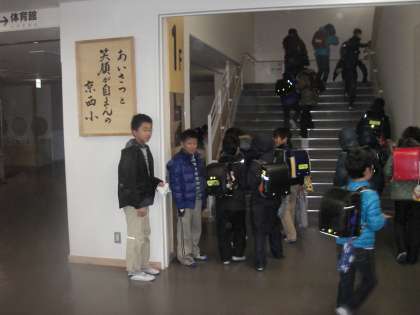 2月1日から6年生が門に立ち、あいさつで下級生を迎えています。6年生が卒業を前に、自分たちで出来ることはないだろうか。京西の伝統を作っていきたいということで考えた取り組みです。今日がスタートです。6年生が笑顔で迎えています。ふざけている子は誰もいません。8時〜8時10分ごろまでは門に立ち、その後は1階の階段のところ立ち、また、あいさつをしています。