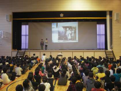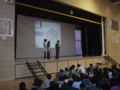 今日の児童集会は保健委員会の発表でした。給食室に取材をし、クイズを交えて報告してくれました。調理師さんたちは作業工程ごとに赤、青、黄色、白のエプロンをつけかえています。準備段階と出来上が段階では作業内容が違います。同じエプロンでは衛生上よくないからです。