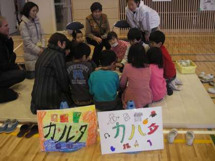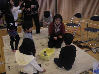昔遊びの紹介をします。あやとり、カルタ、お手玉です。お手玉などは歌を歌いながら昔はやっていました。