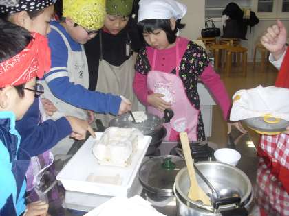 今日は4年生が総合で豆腐づくりの実習をしました。大豆から豆乳をつくりにがりで固めて、豆腐の型に入れて、四角い豆腐にします。どのグループも豆乳から豆腐に変身させられ、大成功でした。