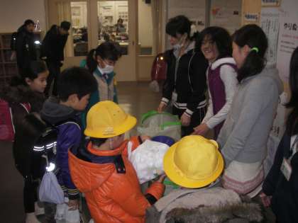 家からキャップを持ってきた子どもたちが続々と来てキャップを入れていきます。キャップによって世界の子どもたちにワクチンが接種されるようになります。
