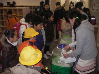 今週はエコ栽培委員会が呼びかける、エコキャップ週間です。委員会の子どもたちが昇降口で回収袋を持って待っています。