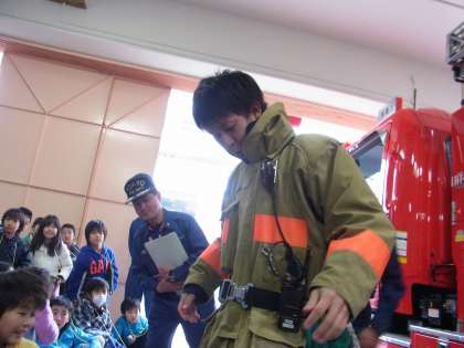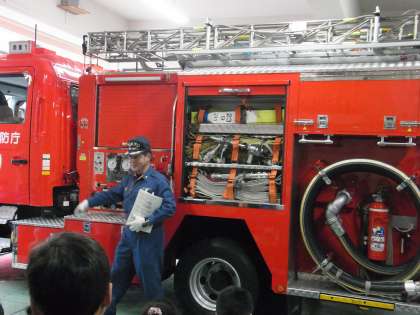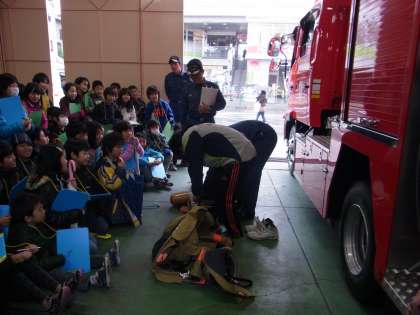 14日、3年生は玉川消防署用賀出張所見学に行ってきました。小雨の降る中ですが元気にあいさつに見学開始です。社会科の「安全なくらし」の単元の学習です。消防の服を着せてもらったり、消防の説明をしてもらったり、くらしの安全を守る大切さがよく分かりました。