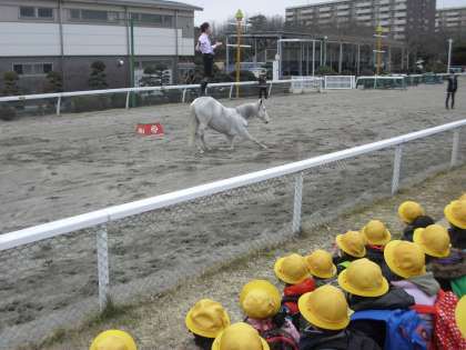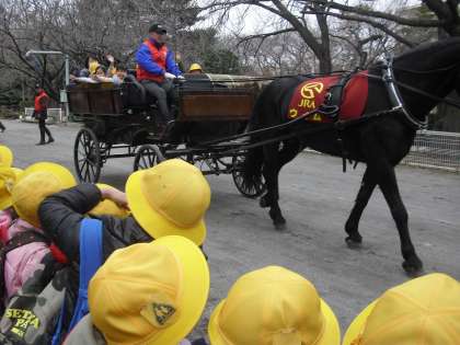 子どもたちは、馬がいろいろな演技を披露する「ホース・ショー」を観覧したり、「馬車の乗車」を体験したりしました。いままで、テレビなどを通して知っていた馬が、目の前で生き生きと動く姿を見て、子どもたちは驚きの声を上げていました。また、馬車に乗ったことがとても楽しかったようで、学校でふり返りのカードに馬車に乗っている絵を描いている子が多くいました。
