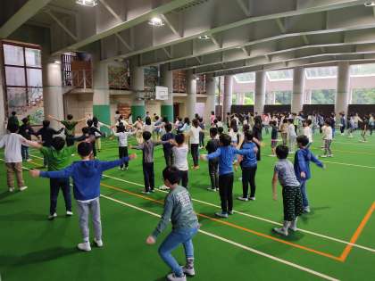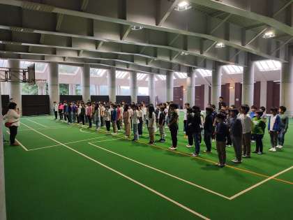 雨が降っているので、朝会は屋根付き広場で行いました。