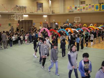 在校生が6年生に感謝の気持ちを表す会です。1年生から5年生まで各学年が感謝の出し物をします。みんなでゲームもします。6年生から在校生へ激励の言葉や合奏合唱が披露されました。