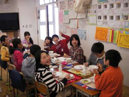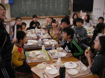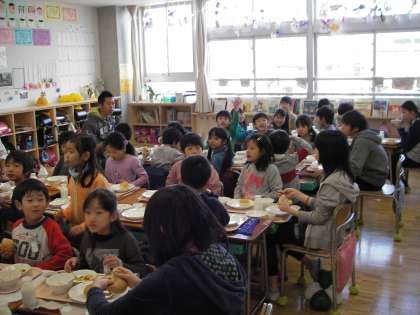 今日は「お別れ給食」です。6年生が1年生から5年生の教室に行き会食です。6年生のお兄さん、お姉さん有り難うございました。と感謝を表す会食でもあります。小さい子どもたちは、6年生が来てくれて大喜びです。