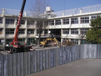 12日、校舎を見てみると校舎が解体されています。次の日に見てみましたら、桜の木の上部がなくなっていました。急ピッチで解体が進んでいます。同時に体育館へ行くための階段工事も進んでいます。