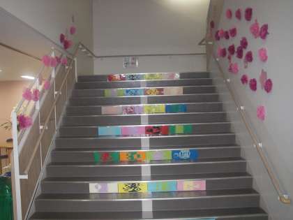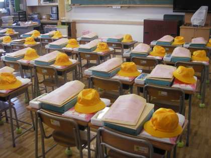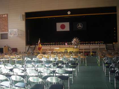 明日は入学式です。新6年生が登校し、教室の準備、入学式の準備を手伝ってくれました。体育館も準備完了です。階段には花が飾られています。教室に入ると机の上には教科書、道具箱、帽子などが置かれています。いよいよ明日が始業式、そして、入学式です。