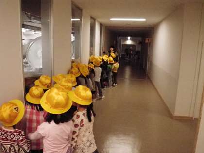 迷子にならないように学校の色々な場所を覚えていきます。保健室、職員室、校長室と周り、給食室を見ているところです。今日から給食が始まります。(校長 箭内)