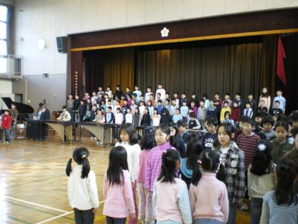 1月24日の音楽朝会は、4年生の合奏と合唱でした。「茶色の小びん」を合奏し、「カリブ夢の旅」を合唱しました。4年生65人がそれぞれの役割を果たし、すばらしい作品を作り上げました。