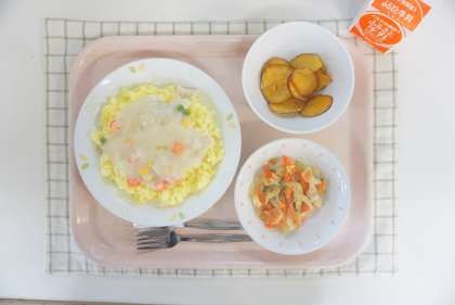 3年生の『カラフル粘土』より、ターメリックライスのカラフルソースがけ