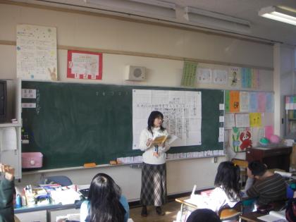 国語説明文「くらしと絵文字」の授業でした。各段落の中心文を見つけよう、という課題で、子どもたちは熱心に取り組んでいました。先生に指名されると、「はいっ」と返事をし、姿勢よくたって発言する姿が素敵でした。発言すると「理由は」とか「なぜかというと」と根拠となる文書、言葉等を示しているところも、きたえられていると感じました。中心文をさがすポイントは、題名と関係がある、前の段落と関連がある、このようにという言葉が使われている等々事前に指導されての活動でした。3年生は、しっかりと学び、鍛えられているという感想を持ちました。